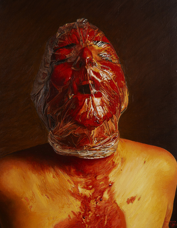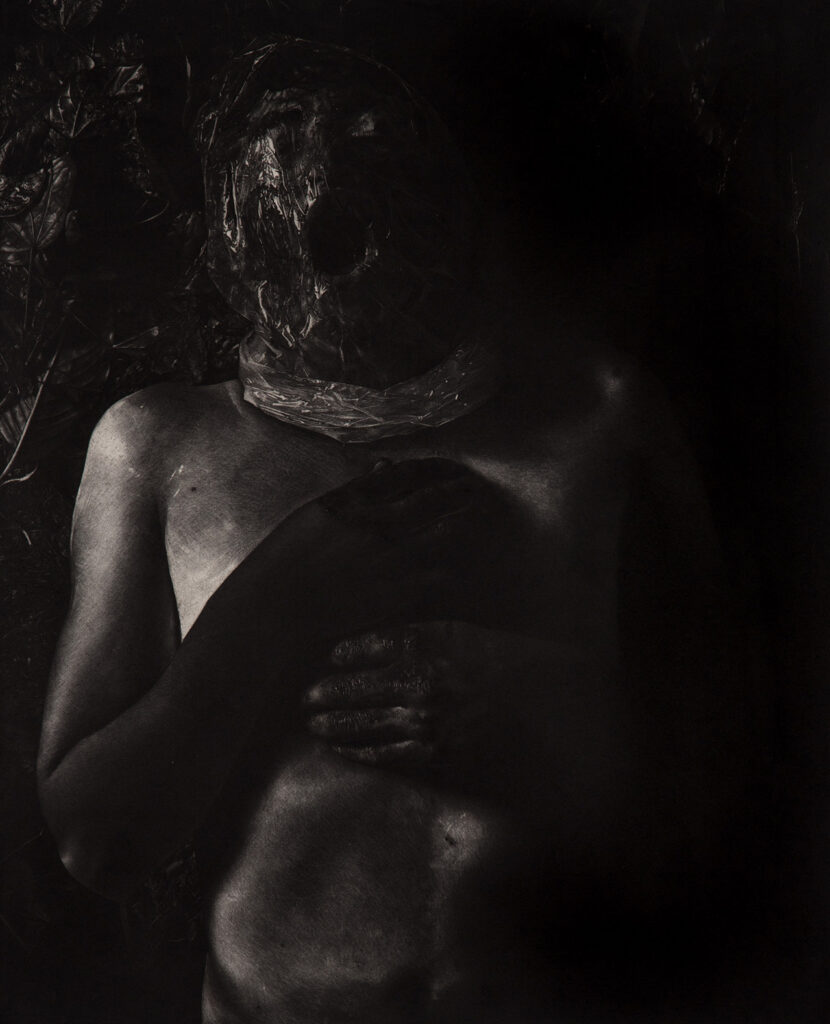 La obra “autorretrato en carboncillo papel/bockingford, joven asfixiado con una bolsa que cubre su rostro, el propio Pineda se retrata en el horror de la tortura, a modo de la obra “El Grito” del expresionista alemán Edvard Munch.