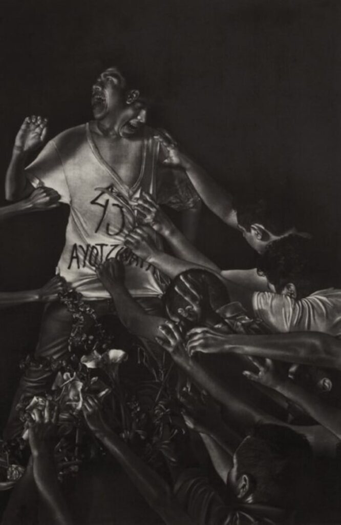Con maestría Pineda sintetiza las corrientes artísticas desde el Renacimiento hasta la actualidad. En el grabado “te encontré el día de mi cumpleaños”, a modo de la “La Piedad” de Miguel Ángel plasma el dolor y ternura de una madre buscadora quien al cesar la búsqueda abraza a su hijo rodeada de flores, homenaje a la gratuidad de la dadora de flores.