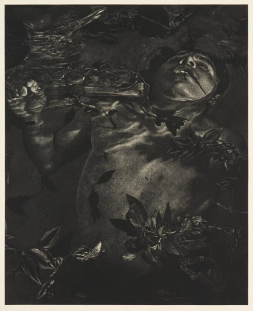 “El ultimo baile”, grabado de un joven ahogado en un lago rodeado de plantas y flores nos recuerda la obra Prerrafaelista de John Everett “Ofelia” Millais, los elementos de flores y plantas se convierte en una constante simbólica en sus obras y funciona como distractor con su belleza del horror de la escena narrada.